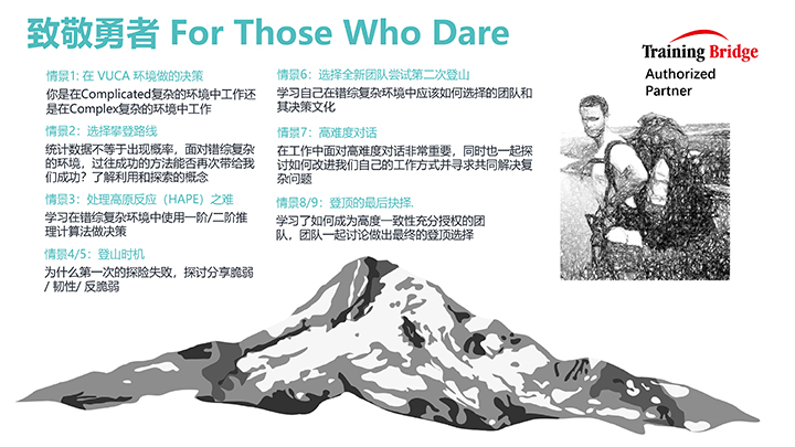 在“巨斧”登山的过程中,他需要面对许多的决策时刻。有些是非常挑战人性,有些是非常挑战团队的凝聚力。我们邀请所有参加的学员一起与 Axe 和自己的学习团队一起在不同的情景做出个人和集体决定,从中帮助我们意识到自己的决策模式和学习在多变的商业环境,也就是 VUCA 环境中是否有更加有效的决策模式。同时学员们也会在课程中经历到如何在极短的时间内建立高度一致和充分授权的团队是如何做出能让他们骄傲并共同承诺和有担当的决定。