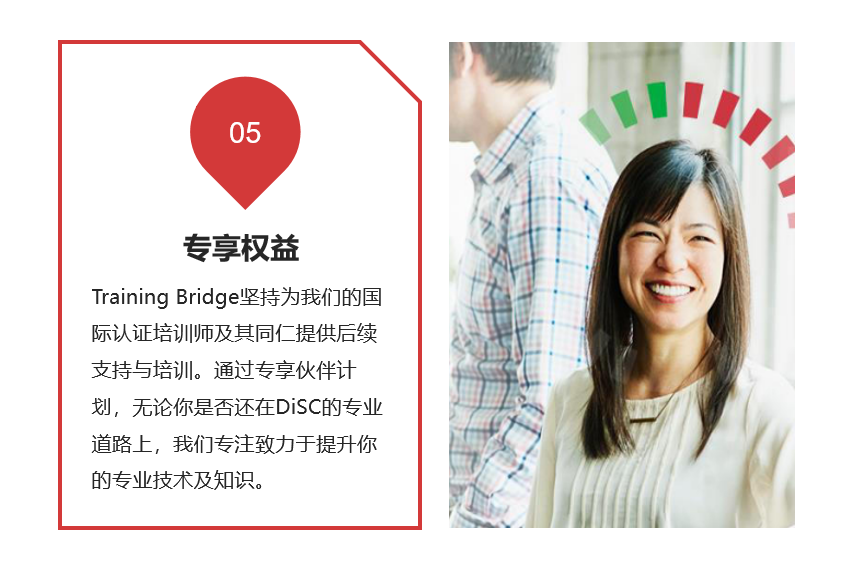 Training Bridge 每年在中国培养和认证众多DiSC国际认证培训师。我们非常乐于成为你的伙伴,把Everything DiSC产品融入到你全套受验证的学习解决方案里,提供给你的客户或企业。
