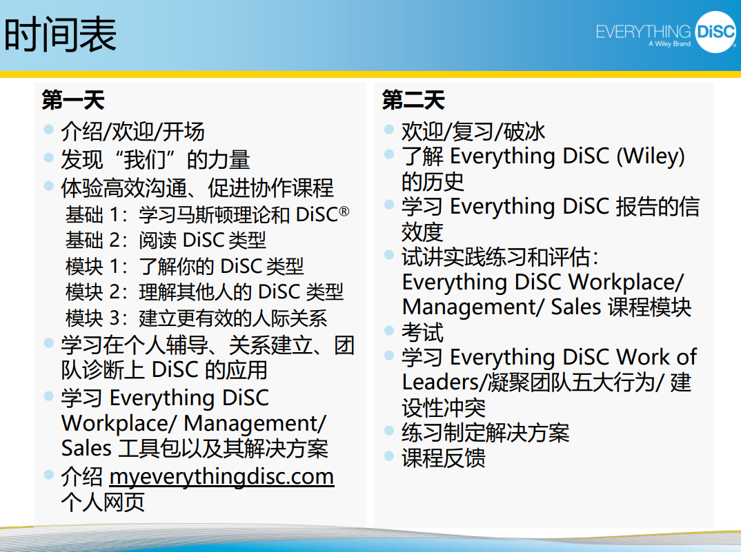 WILEY 集团提供的 Everything DiSC 版权资料/引导工具包(可选):12,900元/个,如您同时购买二个工具包,第二个工具包优惠价: 11,999元/个