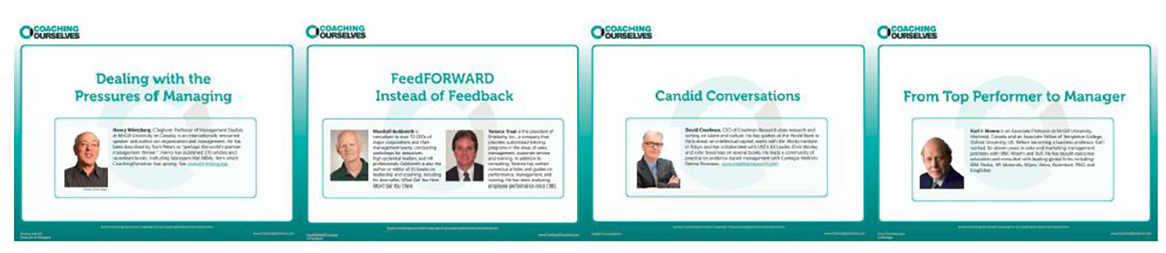 Coachingourselves学习模块的作者为领先的管理和商业思想家和实践者,其中不乏Henry Mintzberg、Edgar Schein、Marshall Goldsmith、Phillip Kotler、Dave Ulrich、Linda Hill、Nancy Adler、Ricardo Semler等大师,凝炼了最深刻最前沿的主题精髓。